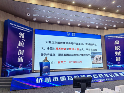 推介会上,我校15件科技成果入选“杭州市属高校线上科技成果库”并进行现场发布,其中特种学院崔荣江老师的“大蒜智能精量定向播种机”项目和友嘉学院陈楚老师的“数字化牛粪沼渣杀菌烘干机”项目被大会选送为优秀成果推荐项目进行展板展示,崔老师还作为本校代表进行了现场路演,向在场包括200余位企业代表在内的政、产、学、研界嘉宾展示,促进成果与产业的对接。商贸学院孙萍萍老师的“一种防倾倒式物流车”科技成果转移转化项目进行了现场签约。信工学院选送的“智能家居模拟系统”和“智能语音识别分类垃圾桶”在推介会现场进行了实物展示。会上,多位领导、参会嘉宾和企业界人士对我校的科技成果项目观看询问、驻足聆听。