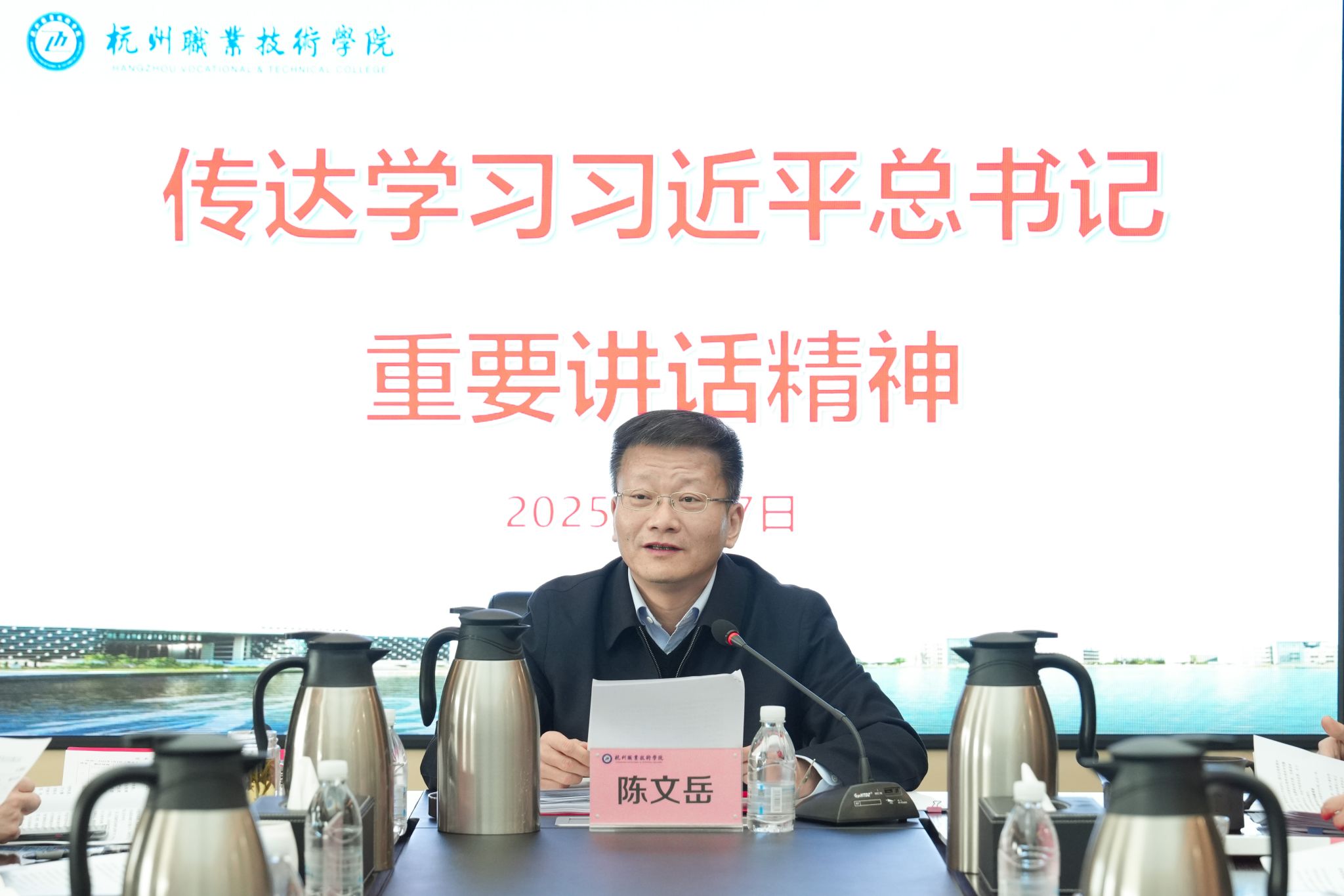 会议强调,习近平总书记的重要讲话高瞻远瞩、内涵丰富,饱含期望、语重心长,赋予了经济大省为全国大局多担当、多贡献的光荣使命,为经济大省扛牢“走在前、挑大梁”使命担当、推进深层次改革和高水平开放指明了前进方向、提供了根本遵循。学校上下要提高政治站位、锚定目标方向,坚决把思想和行动统一到习近平总书记的重要讲话精神上来,深刻认识到发展职业教育是助力共同富裕示范区建设的重要支撑,切实增强工作责任感使命感。深刻认识到科技创新和产业创新是发展新质生产力的基本路径,在教育、科技、人才“三位一体”战略推进中深化职业教育改革与发展,通过向“新”发力,优化专业结构布局,增强前瞻性和引领性;通过提“质”发展,赋能产业发展,融通先进技术、创新人才与产业一线的人才培养路径;通过坚定不移打赢学校“三大攻坚战”,切实把学习成果转化为推动学校高质量发展的实绩实效,以实际行动坚定拥护“两个确立”、坚决做到“两个维护”。