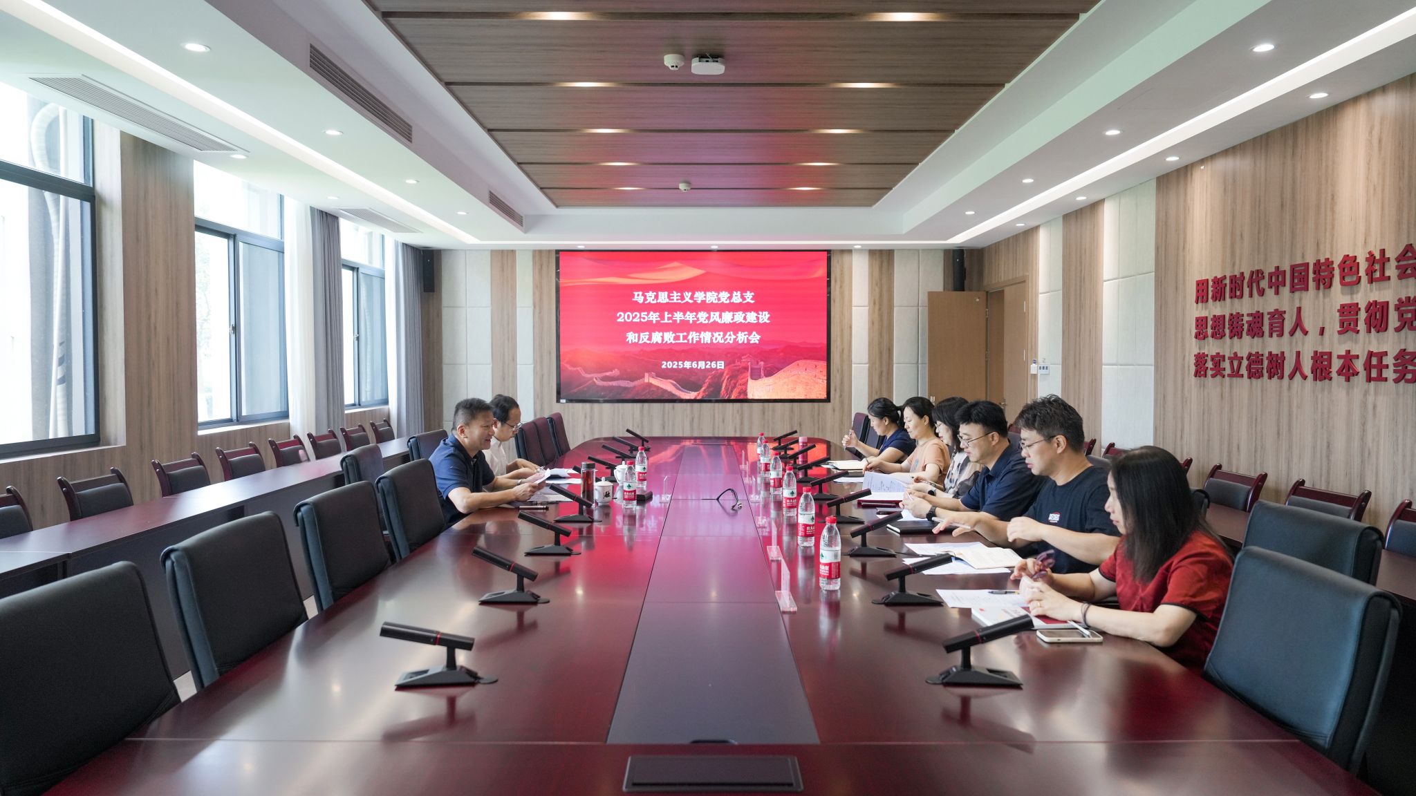为深入贯彻全面从严治党要求,持续深化党风廉政建设,6月26日上午,马克思主义学院党总支召开2025年上半年党风廉政建设和反腐败工作情况分析会。校党委书记陈文岳,校纪委委员、党委学工部部长江平到会指导,马克思主义学院班子成员及相关老师参加会议。会议由马克思主义学院党总支书记、院长邹宏秋主持。