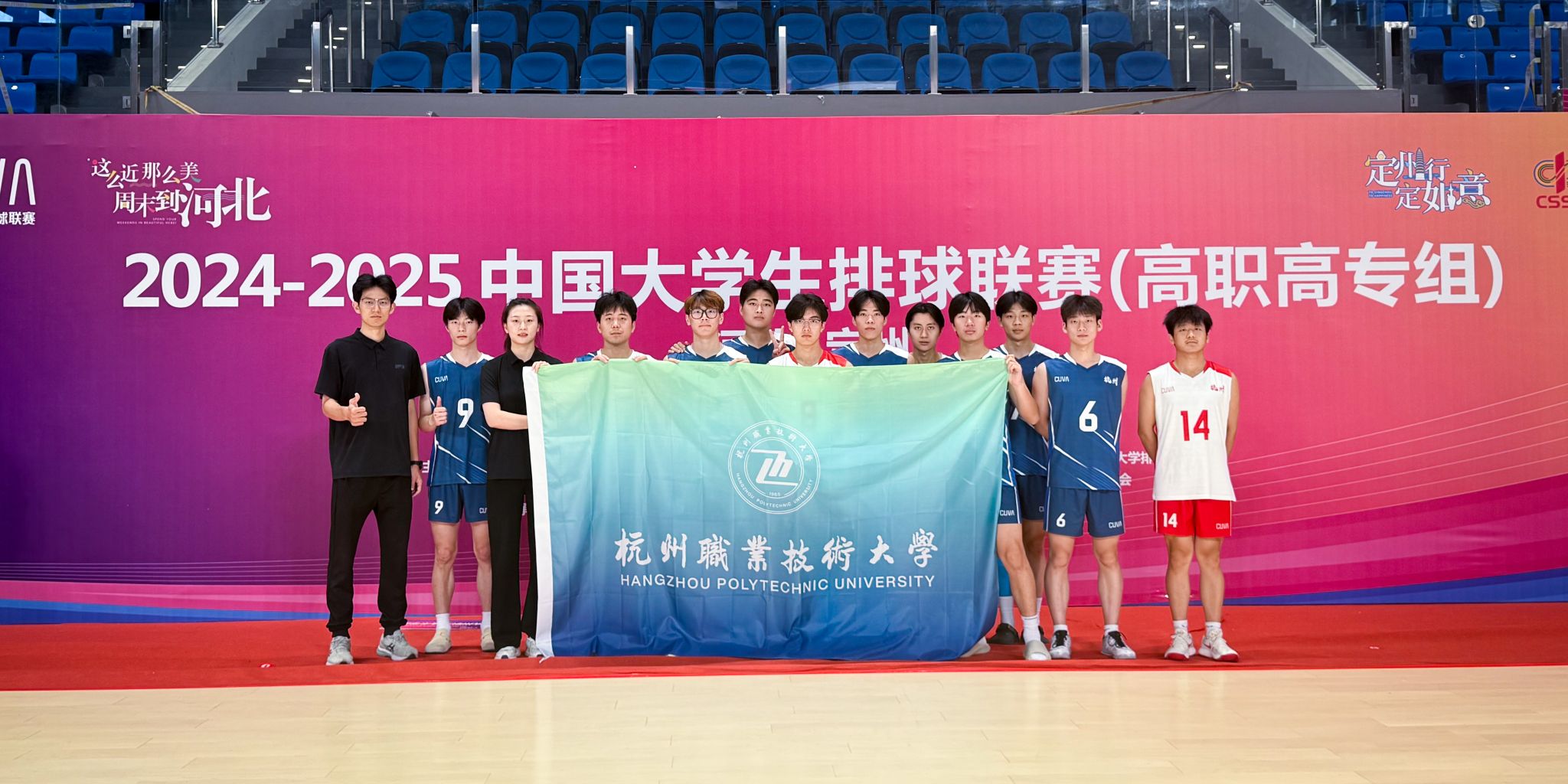 今年的暑期似乎格外炎热。在备战全国赛的阶段,正值暑期最热的一段时间,队员们放弃休息时间,顶烈日、战酷暑,全力投入备战。在7月20日至29日历时10天的激烈赛程中,队员们面对各路强手,将日常训练的汗水与团队的凝聚力淋漓尽致地展现在全国赛场上。小组赛首战四川经贸职业技术学院,以大比分3:0赢得比赛。小组赛最为激烈的一场比赛是对战浙江金融职业学院,在首局胜、二局输、三局胜、四局输的情况下,队员们顶住压力,敢打敢拼,最终以3:2比分获胜,充分展现了我校运动健儿超越自我、勇创佳绩的良好精神风貌。在交叉赛、淘汰赛和五六名争夺赛中,面对实力更强的对手,队员们依然保持高昂斗志,凭借默契配合和精湛技术,一路过关斩将,最终锁定全国第五的佳绩。