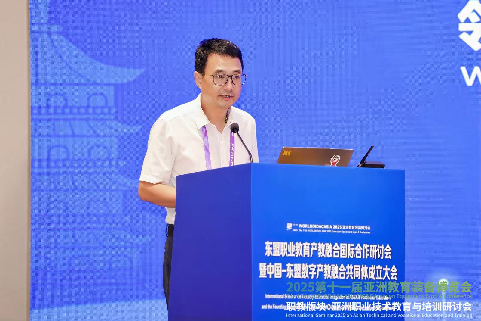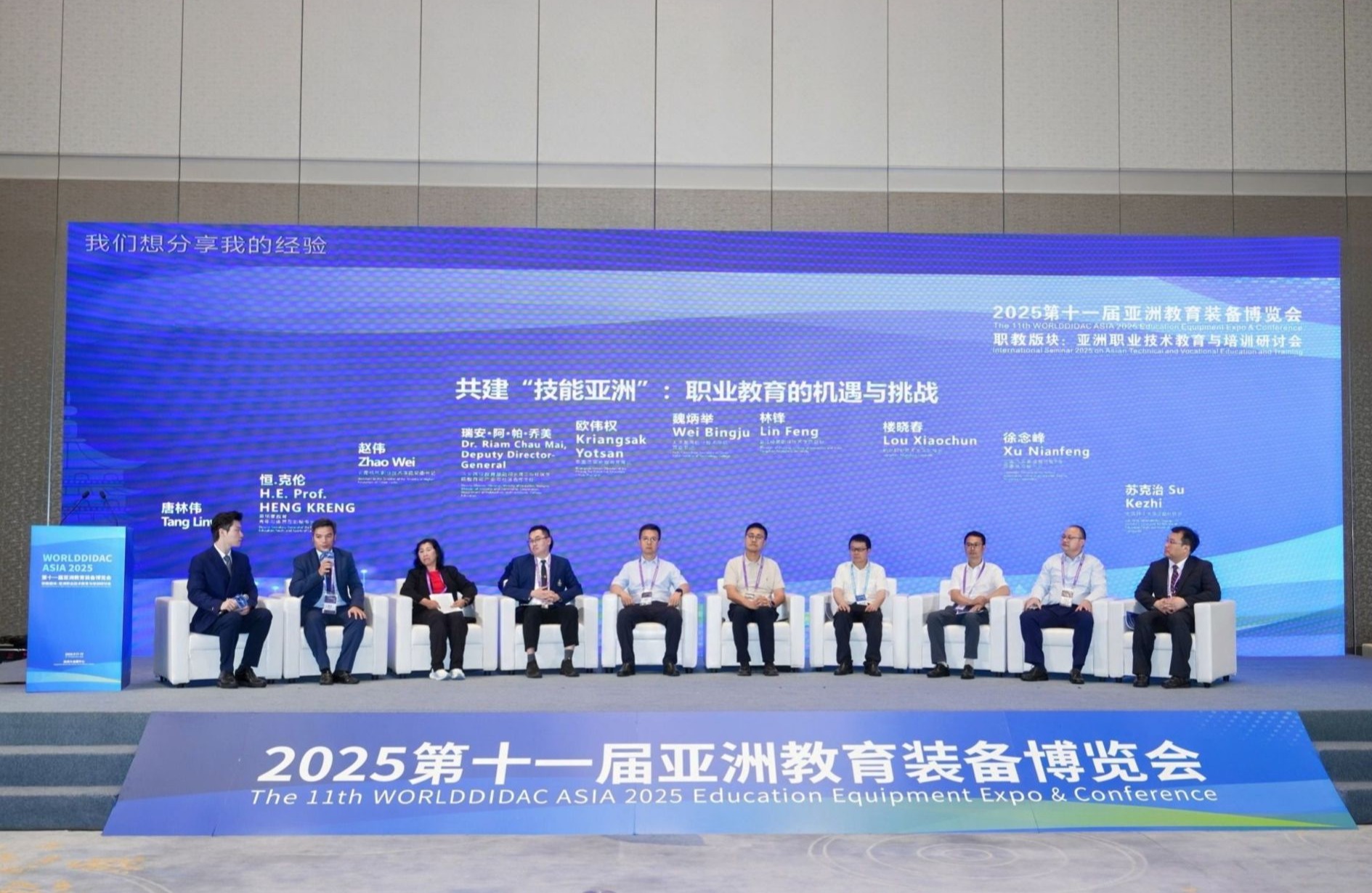 第十一届亚洲教育装备博览会(WORLDDIDAC ASIA 2025)于2025 年9月17日至19日在杭州大会展中心正式举行。作为本届博览会的重要组成部分,由全国高等职业学校校长联席会议、宁波市职业技术教育学会主办,我校协办的职教板块主论坛——“亚洲职业技术教育与培训研讨会”同期开展。本次研讨会吸引了来自15个国家的政府机构、院校及企业代表共300余人参会,为亚洲职业教育领域搭建了高效的交流平台。我校副校长楼晓春受邀出席该主论坛,并参与多场重要交流活动。