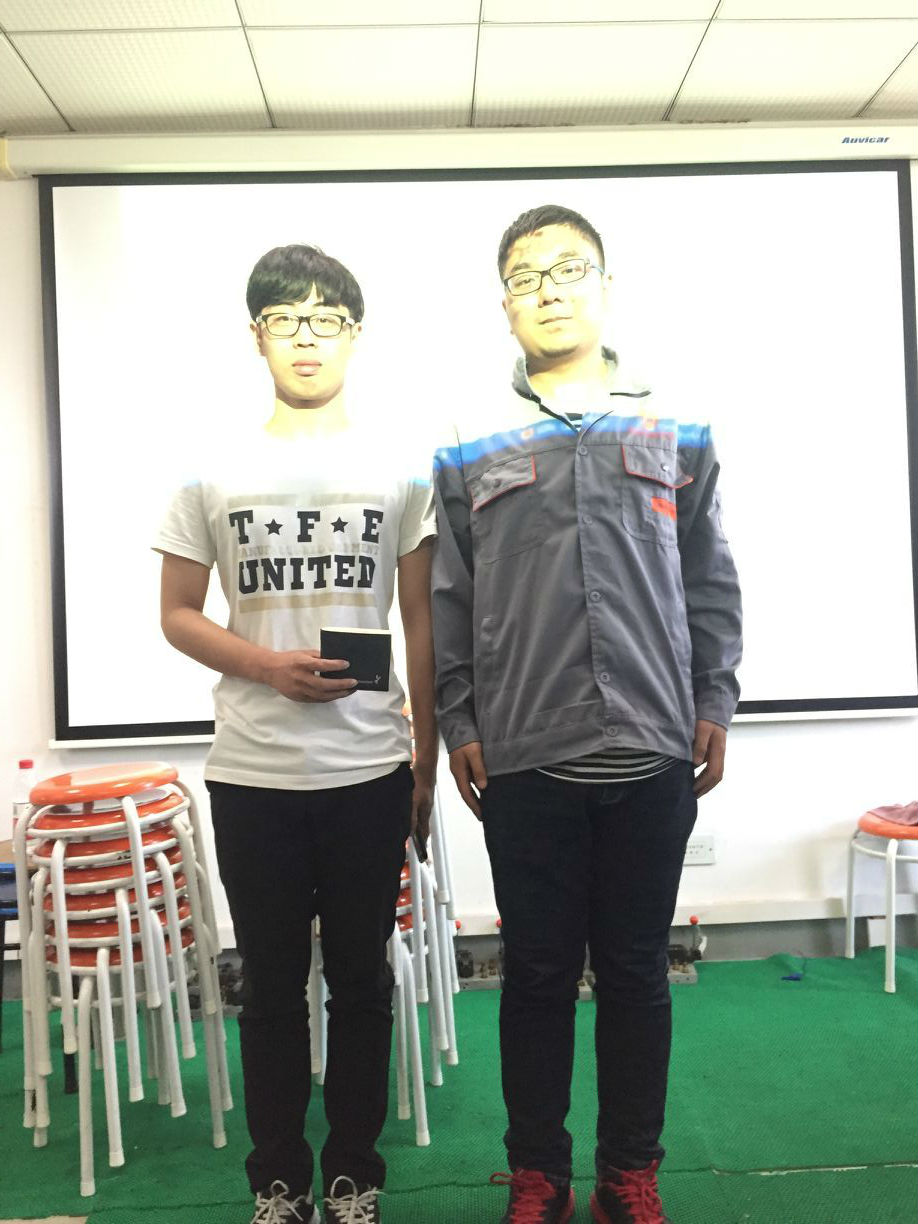 这时,铃声响起,他们便开始上课了。过了一会儿,作为教学督导老师的我刚好巡视到他们班,知道这个事情后,便向负责那边实训室的黄河老师作了了解——上周五使用过这个实训室的是友嘉机电学院的学生,我马上和他们辅导员联系,终于查到“宋洁”为数控1651班的同学。宋洁同学于第二节下课后来到了实训室,由程毓亲手把钱包交到了宋洁的手中,两人还互留了联系方式并合了影,我想他们肯定能成为好朋友的。