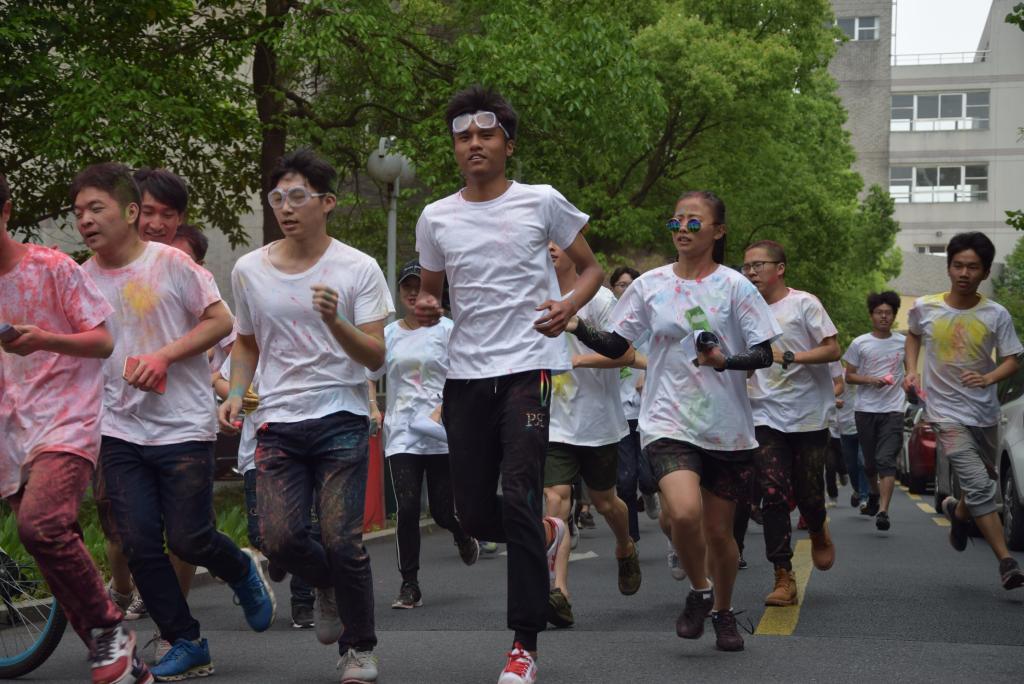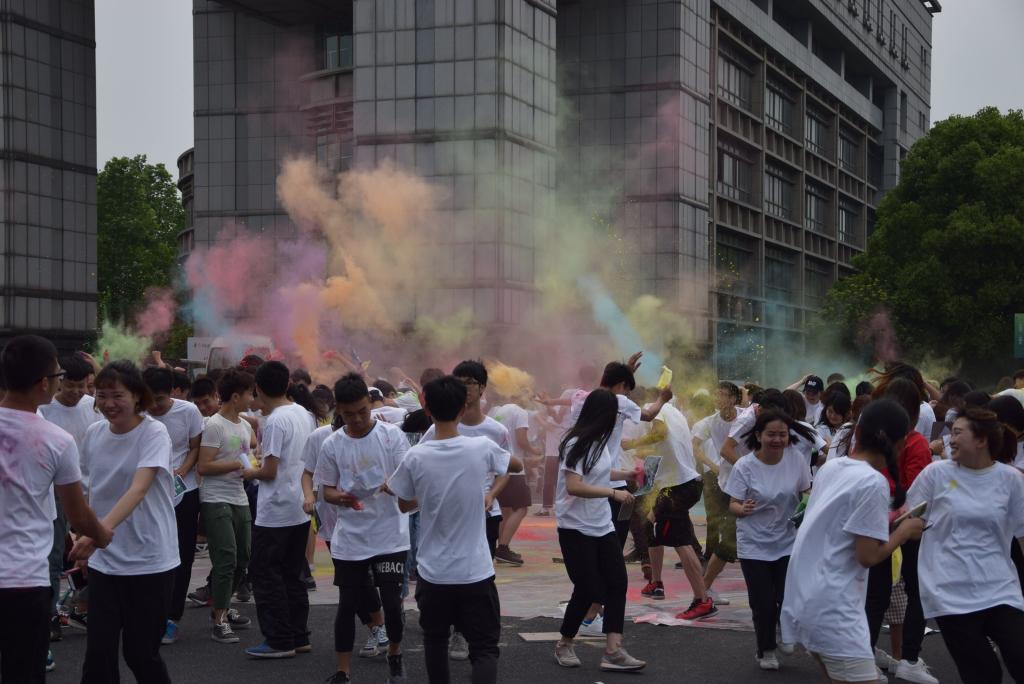 下午两点整,彩跑活动在正式开始。我校团委副书记何霞红老师为本次活动致辞。随后大约四百余人的活动成员先是集合在了善湖边上舞台前面签到,领取发放的白T恤,并由主持人讲解了本次彩虹跑活动的流程和一些注意事项。然后彩跑队伍由善湖为起点,在工作人员的引导下开始了绕杭职校园五公里的彩跑环节。在这五公里的路程里我们社联在校园各处共设置了五个彩粉站,以及校园的各个路口、拐角处都安排了工作人员负责引导活动参与人员。当有参与同学路过彩粉站时,可以通过参与彩粉站里的社团活动领取小礼物和彩粉,然后向一同参与活动的小伙伴们泼洒。但是事后发现因为玩的太嗨,就连路边工作的工作人员也是无辜躺伤,受到了其他小伙伴的“集体围殴”,被撒的“体无完肤”。